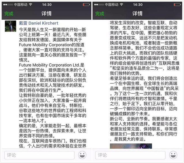 Future Mobility COO 戴雷的朋友圈 目標是打造一個高端電動車品牌的 Future Mobility 注冊在香港,研發(fā)總部位于深圳,傳動技術和無人駕駛技術的研發(fā)分別放在歐洲和硅谷,將在中國進行整車出產。 和諧富騰旗下電動車項目經濟+高真?zhèn)產品組合,很輕易讓人聯(lián)想起車和家、蔚來汽車這兩家電動車創(chuàng)業(yè)公司,他們的車型也分別定位于經濟和高端。 從產品角度來看,未來很有可能泛起愛車 vs. 車和家、Future Mobility vs. 蔚來汽車捉對廝殺的競爭局面。