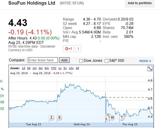 固然搜房本季度仍舊爆出巨虧,但環(huán)比而言,虧損金額已經(jīng)大幅度減少;而且本季度的EPS 也大大好于華爾街的預(yù)期。不外似乎華爾街目前并不買賬,今天業(yè)績公告之后,搜房的股價(jià)收盤價(jià)格跌幅超過4%,交易量超過550萬個(gè)ADS;搜房目前的股票價(jià)格只有4.43美元,已經(jīng)接近過去52周最低價(jià)格的4.27美元。以下為搜房股票價(jià)格趨勢(shì)圖: