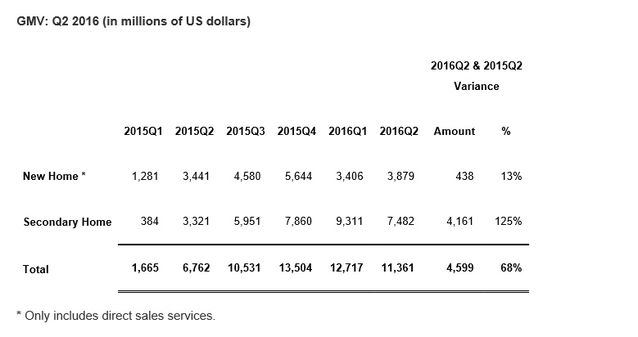 ![]() 2016年8月25日,在美國紐約上市的搜房(房天下 SFUN)宣布了本年度第二季度的業(yè)績。 2016年第二季度的總收入為2.87億美元,收入同比增長率為34.2%;其中互聯(lián)網(wǎng)服務(wù)e-commerce service 收入為1.895億美元,同比增長率高達(dá)77.4%。 2016年第二季度EPS 是-0.09,虧損金額遠(yuǎn)低于華爾街分析師預(yù)計(jì)EPS 均勻值的-0.12。 此外,本季度公司的GMV 增長勢(shì)頭不錯(cuò),同比金額增長68%,這個(gè)指標(biāo)是搜房轉(zhuǎn)型的重要經(jīng)營業(yè)績指標(biāo)之一。以下為公司所宣布的各季度GMV 增長情況: