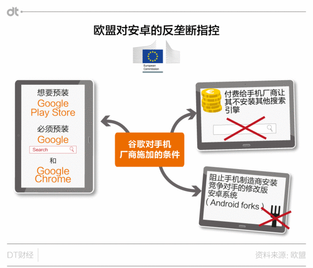 實在,一開始歐盟成立調(diào)查組,就是為了避免案件像此前的微軟反壟斷案一樣,一拖就是十多年。歐盟起初但愿可以快速找到證據(jù),對谷歌進行懲罰。但事到如今回頭看,歐盟顯然沒能實現(xiàn)愿望,如今案件也拖了近六年,而且終極仍是要靠正式訴訟來終結糾紛。 《逐日電訊報》的報道中,也引述分析人士稱,在多年的糾纏之后,谷歌已經(jīng)不想再繼承耗費精力財力,也打算接受罰款終止案件。 歐盟放大招,歷數(shù)谷歌安卓系統(tǒng)的三大罪狀 那么歐盟這30億的罰款,畢竟是因為谷歌的什么罪狀呢? 上月底,歐盟發(fā)布的最新聲明,將戰(zhàn)線擴展到了谷歌移動市場的核心業(yè)務——安卓系統(tǒng)。在歐盟的官方聲明中,歐盟指出了谷歌的三大罪狀: