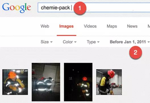 使用images.google.com,鍵入Chemie-pack (1),檢索日期設置在2011年1月(2)以前。得到的結(jié)果有數(shù)百張圖片,這些圖片是大火發(fā)生前幾天,去工廠參觀的集團發(fā)布的。 在一些圖片中,你可以看到化學藥品和它們的名字。通過這些圖片我們可以確定大火前工廠里儲存的一些化學品。 在這個例子中,你通過Google搜索到的大部門圖片已經(jīng)被上傳的用戶刪除了。假如不使用Google,你將無法看到它們。 特別建議:假如想按照日期來查閱Google的索引信息, 1.使用搜索工具Search Tools->Custom Range and type 1/1/1000 2.按照日期進行排序。