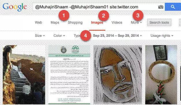 Echosec和Geofeedia可將人物和地點聯(lián)系起來 在這個例子中,我鍵入了殼牌總部的地址(1)但愿找到特定時間(2)內(nèi)在那里工作的人(3)發(fā)布的信息。 8.在Google Images里搜索圖片 良多時候用戶會刪除他們發(fā)布的信息,這時候你就無法在Echosec or Geofeedia里檢索到這些信息。但是你仍是可以通過Google Images來搜尋這些信息。 在下面的例子中,我要檢索Twitter(3)上一個名字是@MuhajiriShaam (1)的賬號,首先要剔除一個非常類似的賬號@MuhajiriShaam01 (2),然后查看他在9月25日到9月29日之間(4)在Twitter上發(fā)布的照片。