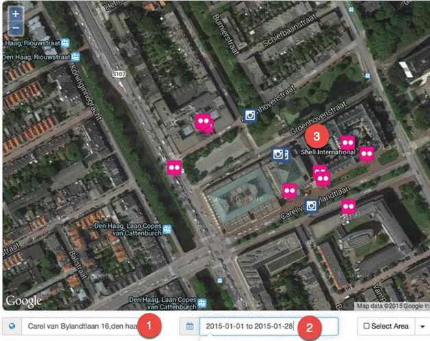你可以在網(wǎng)站尋找信息,來分析你要研究的對象。鍵入你要檢索的樞紐詞(1),選擇時間(2),你可以看到其他人在Twitter上傳的有關(guān)圖片(3)。 假如你要搜索一個特定的時間,你還可以通過期間菜單的“Specific Range”選項設定你需要的時間。 7.使用Echosec 或者Geofeedia來確定人物和位置