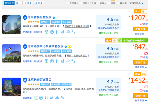 同樣以北京地區(qū)為例,在攜程的酒店頁面勾選“五星級/豪華”后,泛起的酒店以香格里拉、凱賓斯基、威斯汀、喜來登等高端連鎖酒店、以及國際飯店等單體高端酒店為主?蛦蝺r(jià)普遍在800-1500左右。
