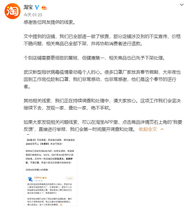 1月27日消息,今天凌晨,淘寶官方微博宣布,針對網(wǎng)友曝光有淘寶店肆口罩呈現(xiàn)不實(shí)宣傳、價(jià)格不穩(wěn)等問題,淘寶官方已對相關(guān)店肆悉數(shù)逐個(gè)核查,部分店肆涉及到的不實(shí)宣傳、