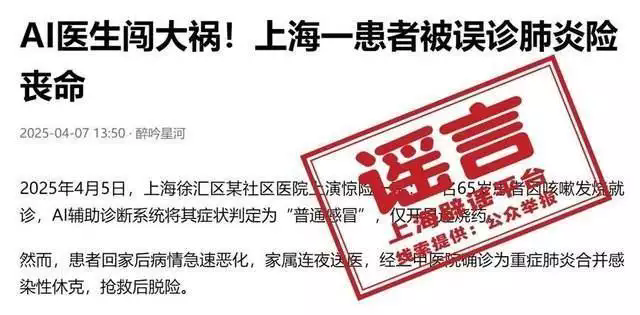 近日 有讀者向上海辟謠平臺詢問 網(wǎng)傳“AI醫(yī)生闖大禍! 上海一患者被誤診肺炎險喪命”的消息 是不是真的?關于“上海患者被AI誤診喪命獲賠127萬”的消息在社交平臺和部分自媒體上傳播,