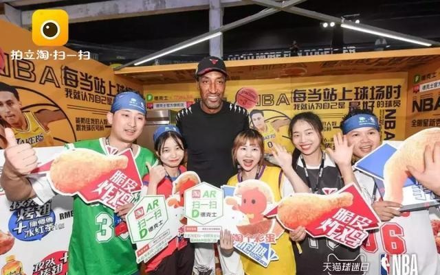 在本年NBA Hoop Party直播現(xiàn)場,NBA巨星皮蓬出現(xiàn)在現(xiàn)場,與他一同合影的工作人員手舉德克士的牌子,提示現(xiàn)場球迷運用淘寶APP掃一掃德克士LOGO,