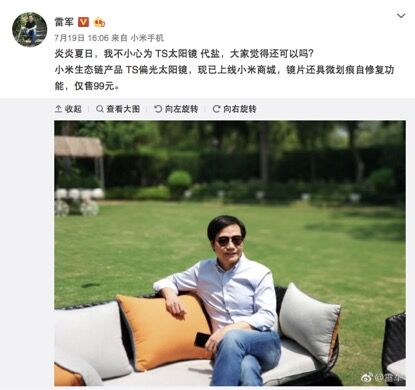 8月15日音訊,上個(gè)月,小米商城上架了一款定制版的米家太陽(yáng)鏡,隨后小米雷軍試戴了該款產(chǎn)品,并頂著炎炎酷日在戶外秀了一把買家秀,其