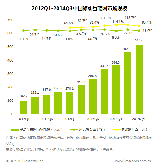 艾瑞咨詢數(shù)據(jù)顯示,2014年第三季度中國移動互聯(lián)網(wǎng)市場規(guī)模達(dá)到515 6億元,環(huán)比增長11 0%,同比增長93 4%。移動互聯(lián)網(wǎng)市場經(jīng)由近幾年的快速