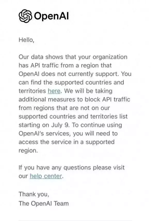 6月25日,OpenAI向中國(guó)用戶發(fā)布郵件稱,自7月9日起阻止來(lái)自非支持國(guó)家和地區(qū)的API流量。這意味著OpenAI將終止對(duì)包括中國(guó)大陸在內(nèi)的地區(qū)提供API服務(wù)。
