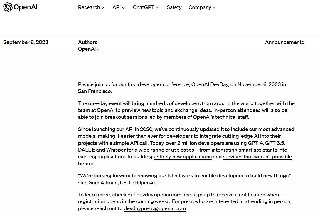 9月7日電 當(dāng)?shù)貢r間6日,美國人工智能公司OpenAI在官網(wǎng)發(fā)布公告稱,將于11月6日在舊金山舉辦公司的首屆開發(fā)者大會。 公告介紹,