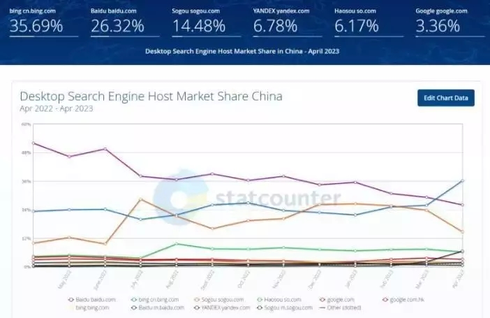 我國(guó)的查找引擎商場(chǎng)正在發(fā)生巨變。據(jù)美國(guó)一家網(wǎng)站流量檢測(cè)組織StatCounte顯現(xiàn):從2022年到2023年,百度的查找流量比例急劇下降至39.64%,
