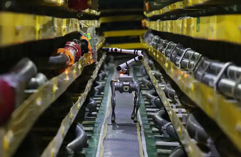 “機器狗巡檢”和“人形機器人分揀”是“人工智能+制造”領(lǐng)域兩個典型的應(yīng)用場景。人形機器人精準完結(jié)物料抓取與分揀動作,機器狗正沿著預設(shè)道路進行巡檢