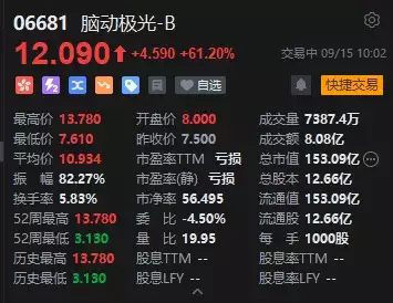 港股腦動(dòng)極光-B在2025年9月15日的交易中表現(xiàn)非常驚人,一度拉升大漲超80%,報(bào)13.78港元,為接連第三日上漲,股價(jià)創(chuàng)上市新高,