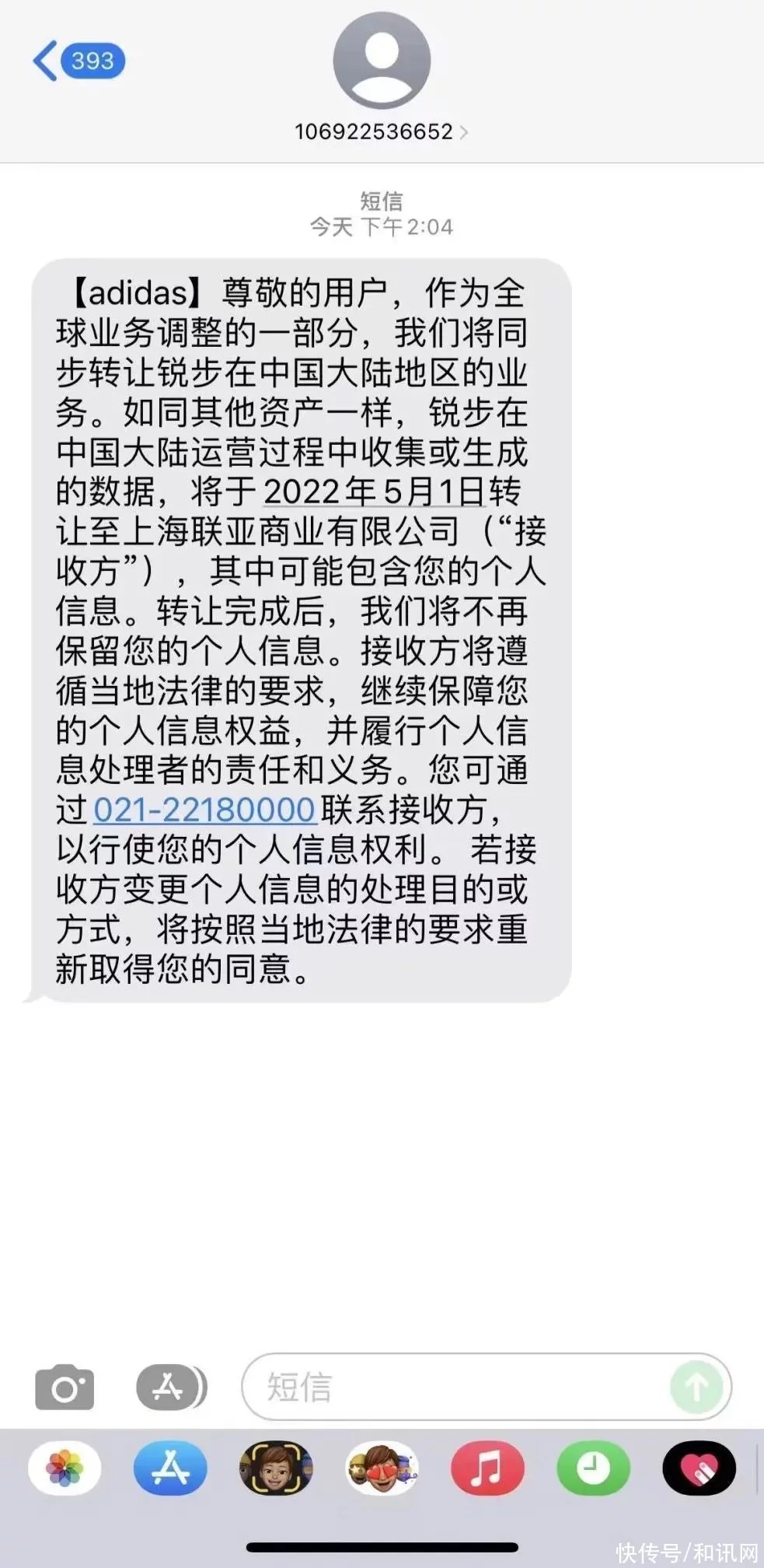 4月18日,多位顧客表明收到阿迪達斯的短信,被奉告其個人信息將與銳步事務同步轉讓給上海聯(lián)亞商業(yè)有限公司。 短信稱,