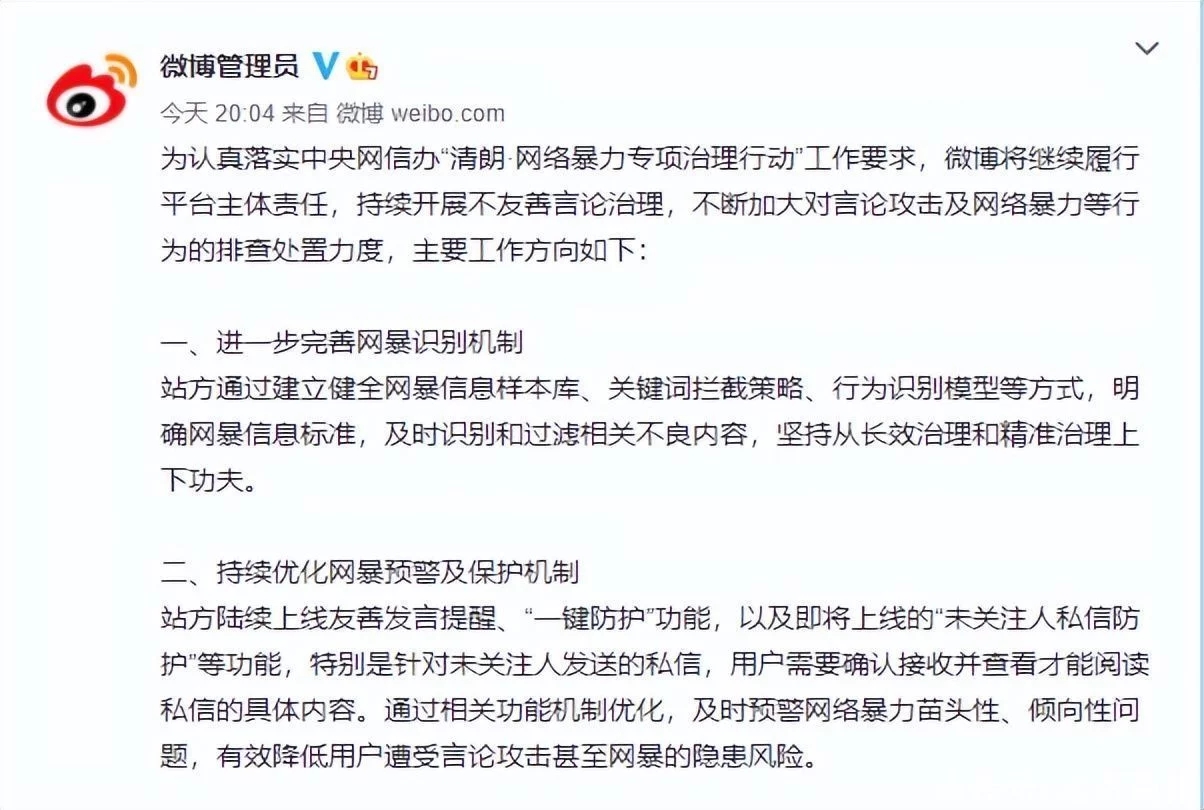 微博管理員發(fā)文稱,為認真落實中央網信辦“明亮清明·網絡暴力專項管理行動”作業(yè)要求,微博將繼續(xù)履行渠道主體職責,持續(xù)展開不友善言辭管理,