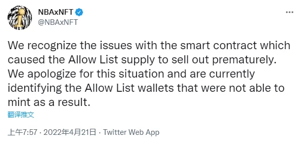 4月21日音訊,美國國家籃球協(xié)會(NBA)旗下NBAxNFT官推特發(fā)文稱:“咱們認識到智能合約的問題,它導致白名單供應提早售罄。目前正在識別白名單中無法鑄造NFT的錢包!