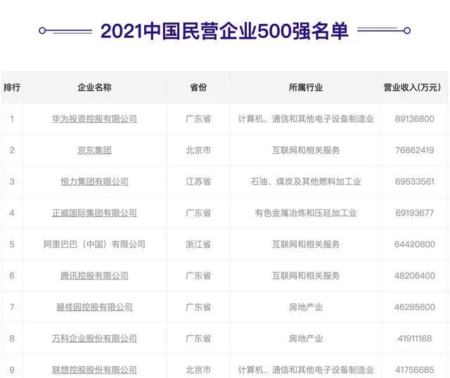 在新的我國民營企業(yè)500強排行榜傍邊,京東憑借著7686.2419億元營收逾越阿里巴巴6442.08億元營收成為了我國排名第二大民營企業(yè),僅次于8913.68億元營收的華為,