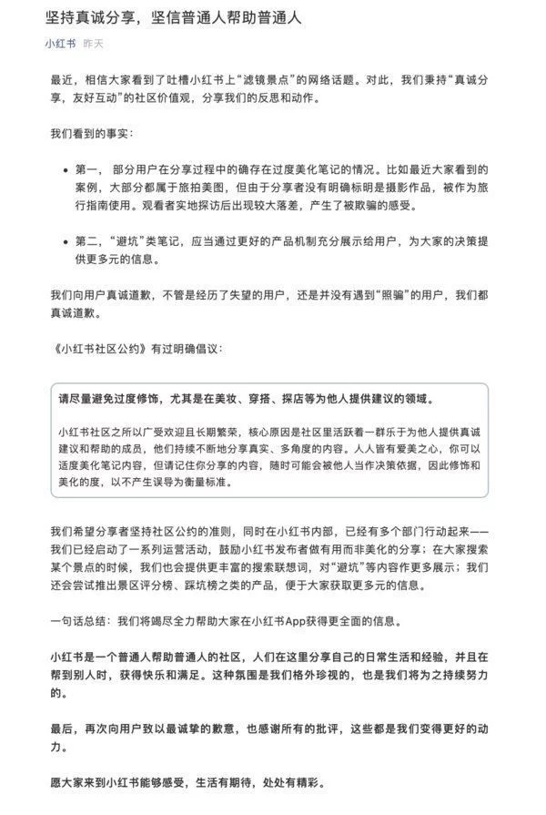 10月17日,小紅書就“濾鏡景點”一事發(fā)表聲明。官方表明,將秉持“真摯共享,友好互動”的社區(qū)價值觀,共享咱們的反思和動作。而且,小紅書向用戶真摯抱歉,