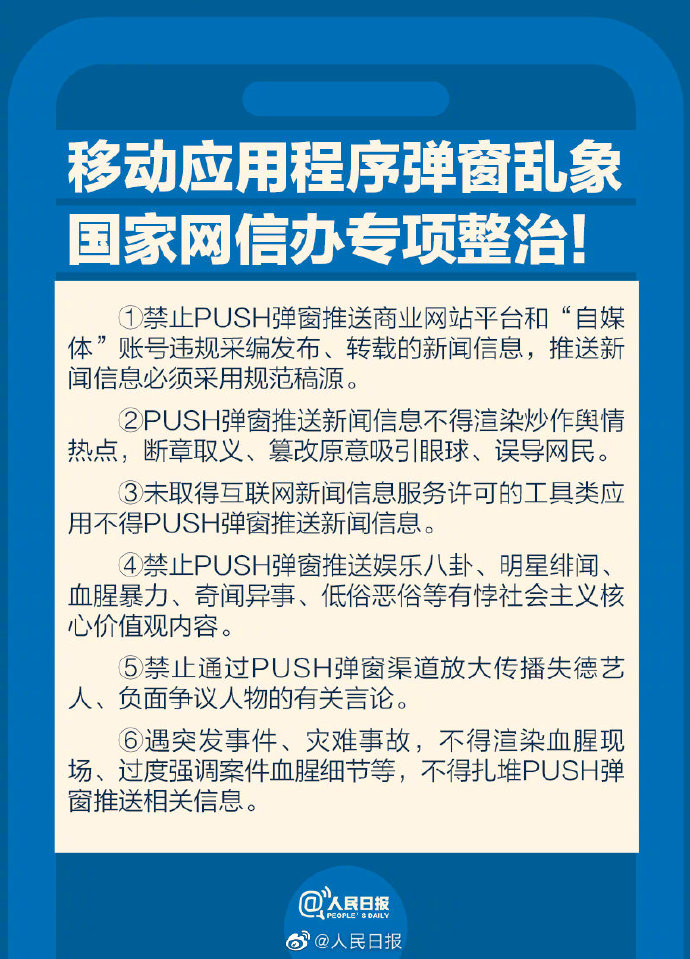 今起,國家網(wǎng)信辦將發(fā)動“清朗·移動使用程序PUSH彈窗突出問題專項整治”,清晰六項整改要求:①禁止推送商業(yè)網(wǎng)站途徑和“自媒體”賬號違規(guī)采編發(fā)布、轉(zhuǎn)載的新聞信息;